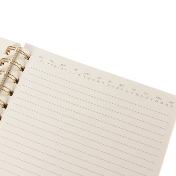 Nuestras libretas de espiral con cubierta de cuero vegano son elegantes y flexibles, lo que las hace perfectas para llevar contigo a cualquier lugar. Cuentan con un encabezado sin fecha en la parte superior para que puedas marcar el día y mantenerte organizado. ¡Nunca más olvides una idea brillante! Un equilibrio ideal entre estilo y funcionalidad, esta libreta es el compañero perfecto para tus pensamientos, notas y proyectos diarios.